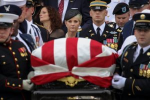 The service lasted around two and a half hours. One of the most poignant moments came near the end when, during a rendition of “Danny Boy”, McCain’s widow Cindy sat stoically as tears settled on her right cheek.