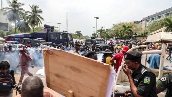Personnel of the Lagos State police command fired teargas canisters at persons who staged a protest at the Lagos State House of Assembly complex on Wednesday over ongoing demolitions in several communities.