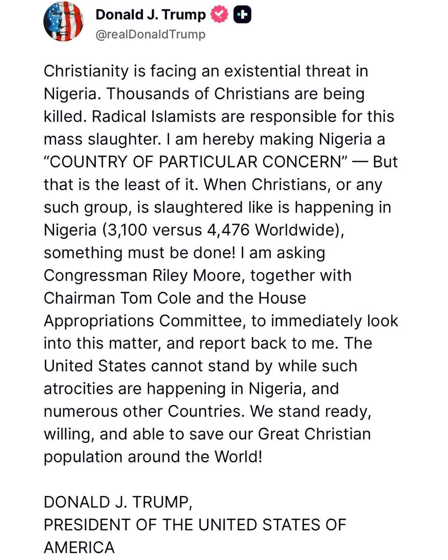 “The United States cannot stand by while such atrocities are happening in Nigeria, and numerous other Countries. We stand ready, willing, and able to save our Great Christian population around the World”!