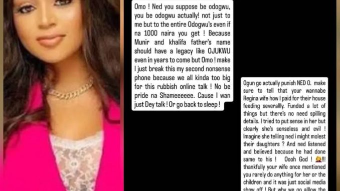 Regina referred to Ned as an “Odogwu” whose name should carry legacy for the sake of their sons, Munir and Khalifa, but said online drama has now made everything look messy.