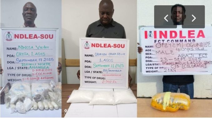 At the time they were preparing their consignments for export, NDLEA-SOU operatives who have for months put them under surveillance, swooped on them in different parts of Lagos. Nwosa was arrested on Wednesday 17th September 2025 at his 16 Femi Kila street, Okota home where 4.33 kilograms of heroin and 448 grams of cocaine were recovered during a search of his house. In his case, Obiegbu was arrested on Thursday 11th September at his 5 Shada Shonefun street, Aguda Surulere home where in the course of a search, 2.902 kilograms of methamphetamine were uncovered and seized.